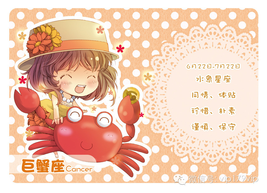 巨蟹座 蟹子是蛮宿命论的星座,所以他们和射手座、水瓶座这些缘份星座也是很有可能在一起的。蟹子和射手座,一个是居家星座,一个是旅行星座,真是天差地远,不过因为差太多了,蟹子安静详和的气质反而容易吸引到射手座的注意,而蟹子也容易给射手带来安全感,让射手有“根”的感觉哦!蟹子和瓶子也是两个差十万八千里的星座,不过蟹子的单纯也很容易让瓶子对他们特别的注意,而平常不太用脑蟹子就很崇拜瓶子出众的智能,所以也就有机会互相吸引啰!